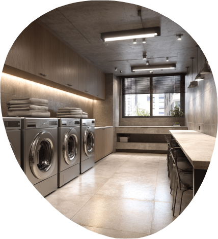 Un espacio útil que facilita tu día a día. La Lavandería Comunal está equipada para que puedas resolver tus necesidades de lavado de manera rápida, práctica y compartida, ahorrando tiempo y celebrando la comodidad en comunidad.